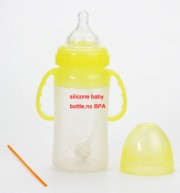 全硅胶宽口径大奶瓶 产品名称:全硅胶握把宽口径大奶瓶 产品编号:YUGUI-BOTTEL 产品容量:230ML 产品颜色:蓝,绿,黄,粉 1.无环境激素(双酚A),无毒性 硅胶奶瓶不含对婴儿有害的环境激素,也没有毒,即使婴儿拿着咬,吮也不会有害。 2、 耐高温、无味的奶瓶 “自然乳感”奶瓶可煮沸消毒,无色、无味、无毒,长时间储存食物或液体也不会产生塑料或者橡胶容器的那种气味,可以保持新鲜。 3、 有利于孩子情绪的稳定 硅胶柔软如皮肤的感觉,会对婴儿的情绪起到稳定作用